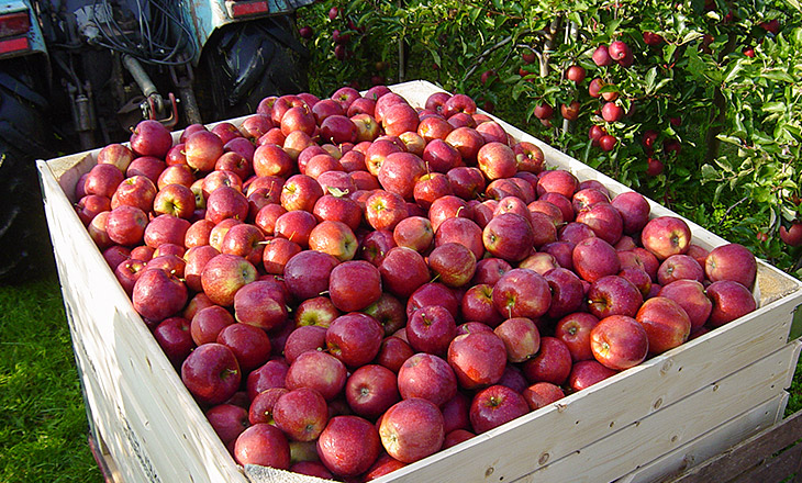 Im Rahmen der Ernte erfolgt aufgrund unterschiedlicher Reife und Fruchtgröße zur Verbesserung der Fruchtqualität ein zeitlich abgestimmtes mehrfaches Durchpflücken der Plantagen. Die Äpfel werden direkt vom Baum in die Erntegroßkisten gelegt, da aufgrund der heute vorherrschenden Baumhöhe überwiegend ohne Leiter geerntet wird. In der Regel stehen die Großkisten auf niedrigen Anhängern, die zu einem Pflückzug zusammengekoppelt werden. Zur Schonung des Bodens kommen Breitreifen am Schlepper zum Einsatz.